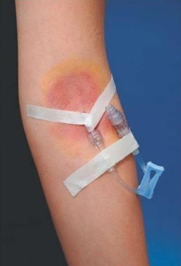 Extravasation: unintentional leakage of fluid out of a blood vessel into surrounding tissue.