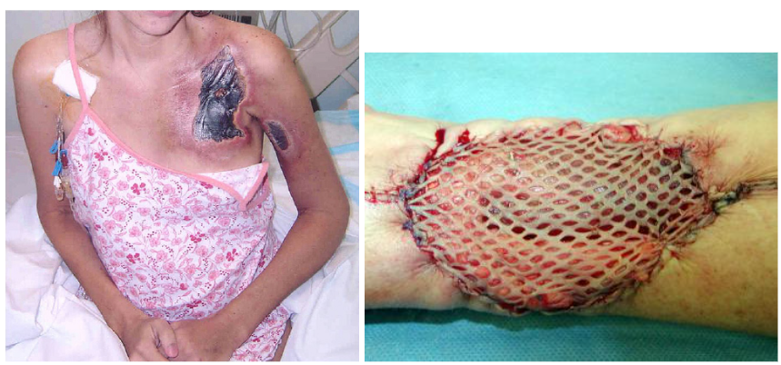 Early on in wound documentation the wound appears to look like a second degree or partial thickness burn that progressed to a full thickness wound that required a split thickness skin graft with removal of eschar.